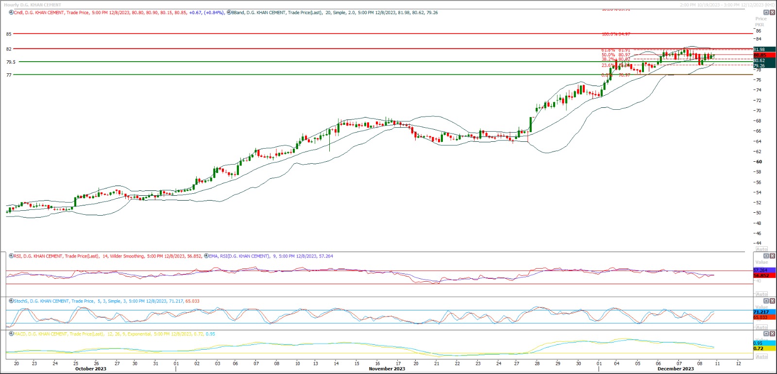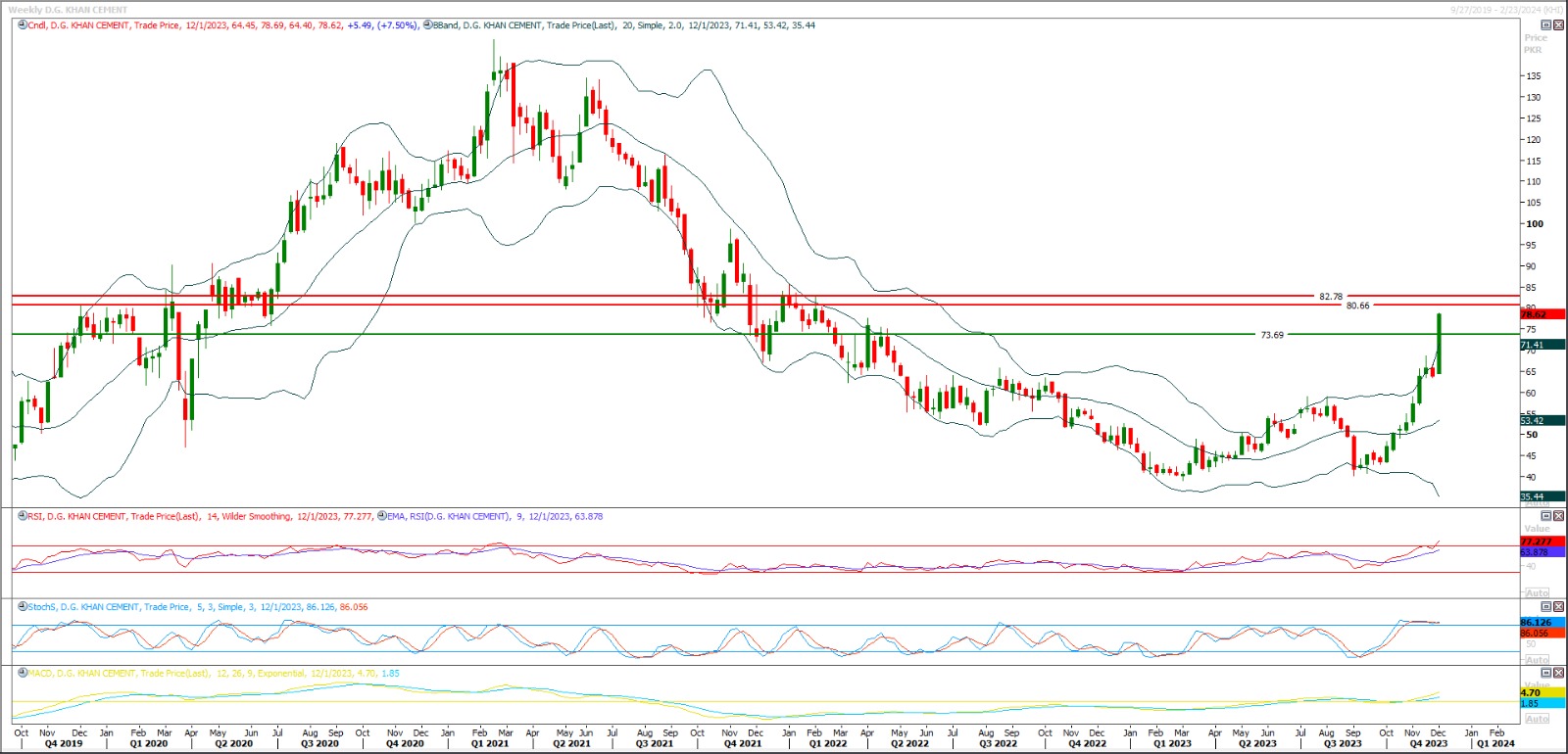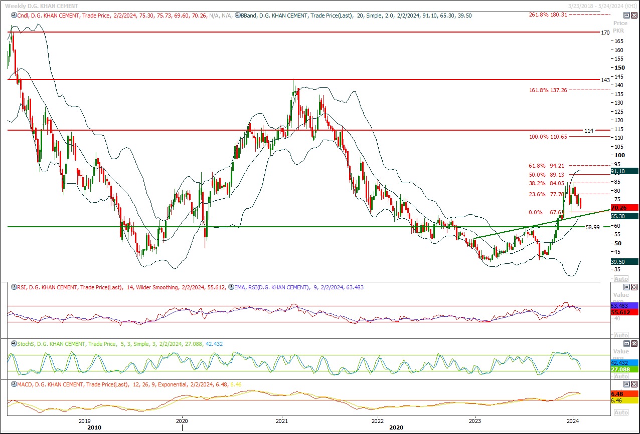 Buy as long as trading above 76.50 with strict stop loss of 73.70 and profit target at 80.60 and 82.70. Key resistance region for DGKC is 85.50 therefore it's recommended to stay cautious near this region.
