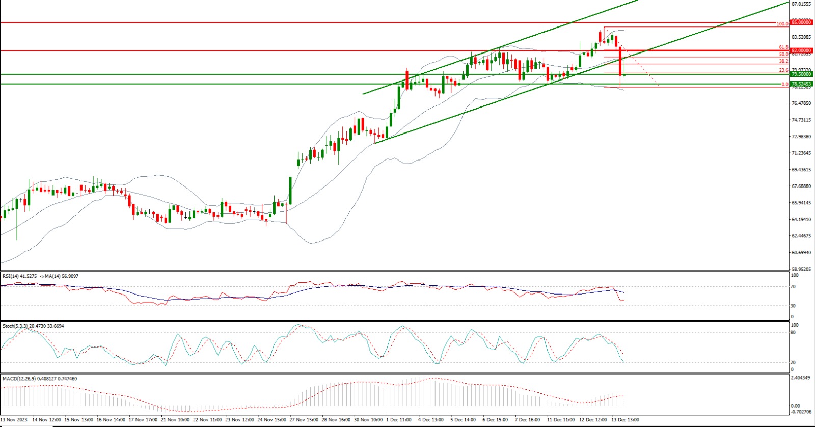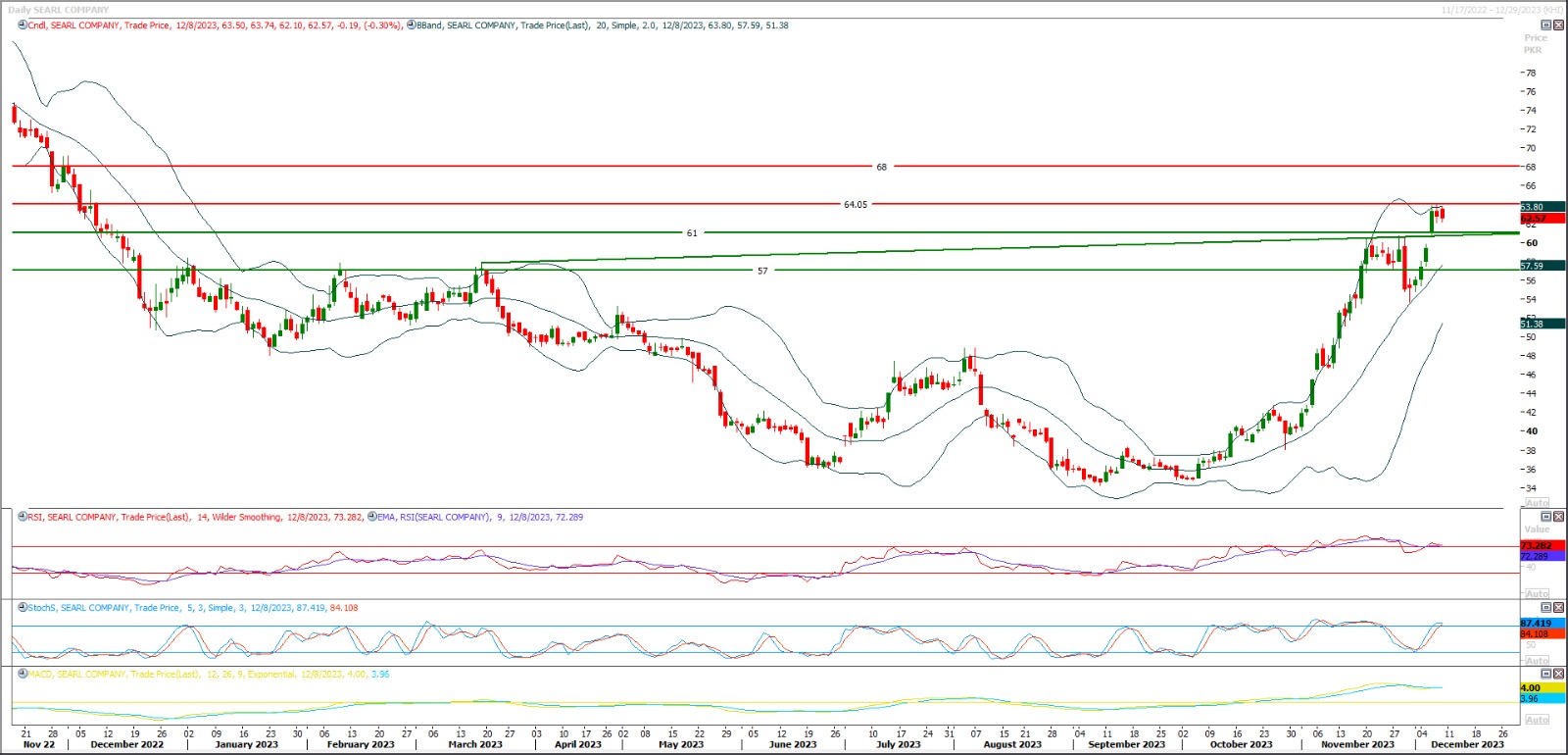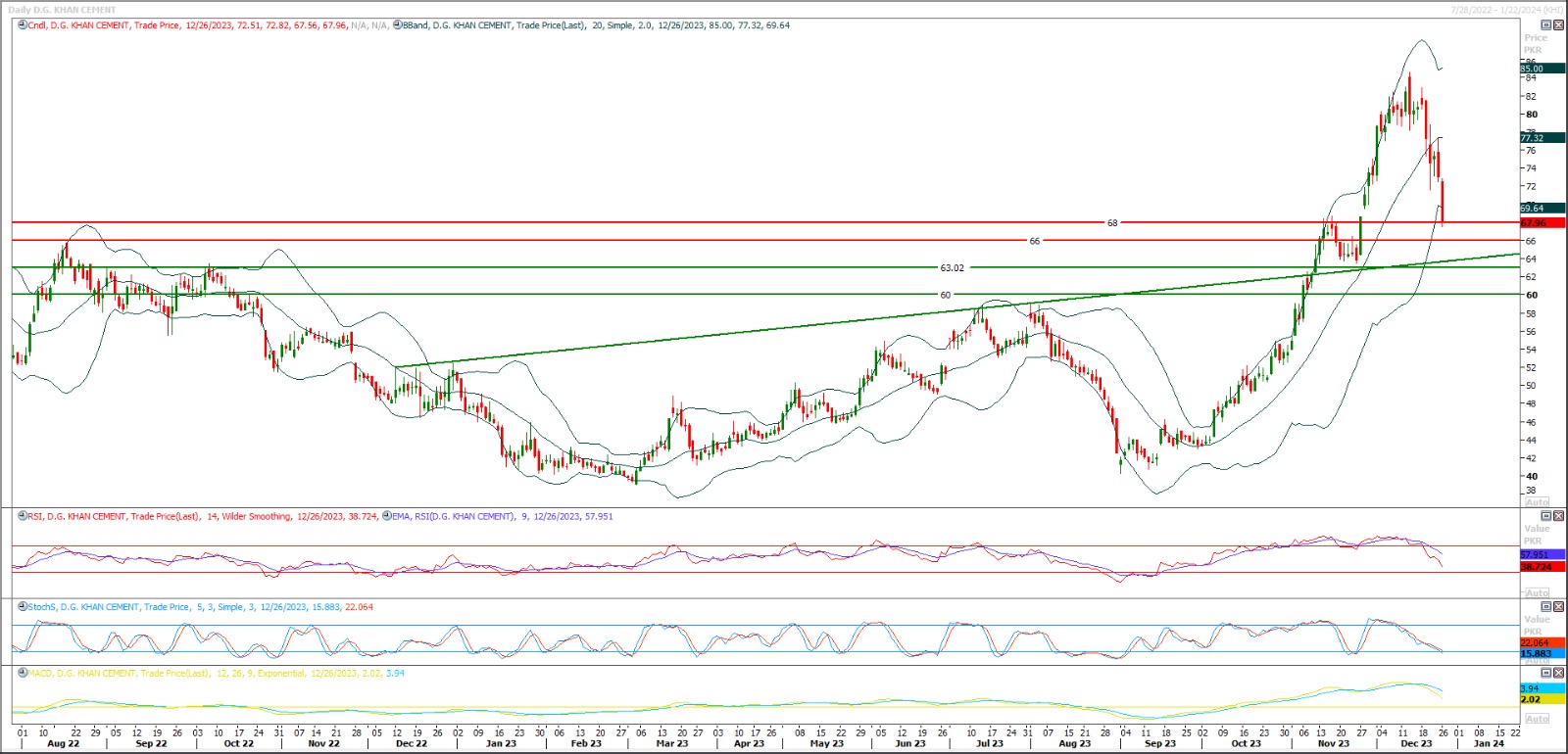 Buy as long as trading above 76.50 with strict stop loss of 73.70 and profit target at 80.60 and 82.70. Key resistance region for DGKC is 85.50 therefore it's recommended to stay cautious near this region.