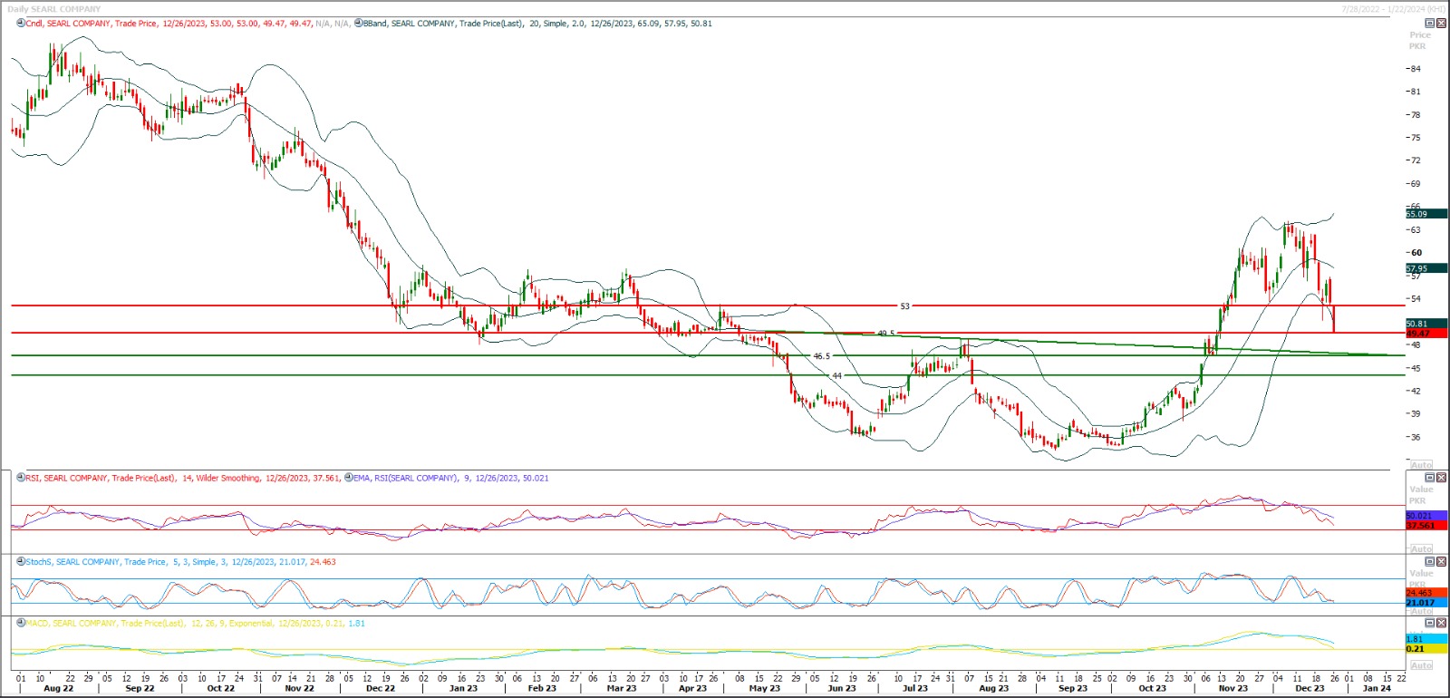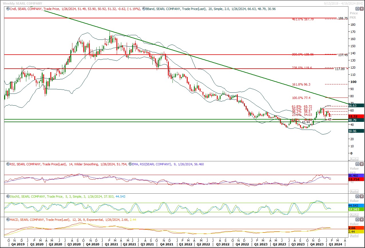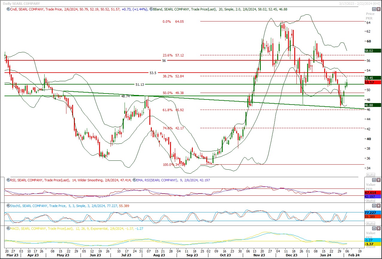 Buy above 58 with strict stop loss of 56 and profit target at 63.50 and 65. On breakout above 61 next key resistance is 65 and breakout above 65 will call for 72 and final target for SEARL is 81