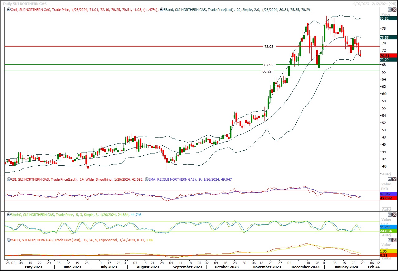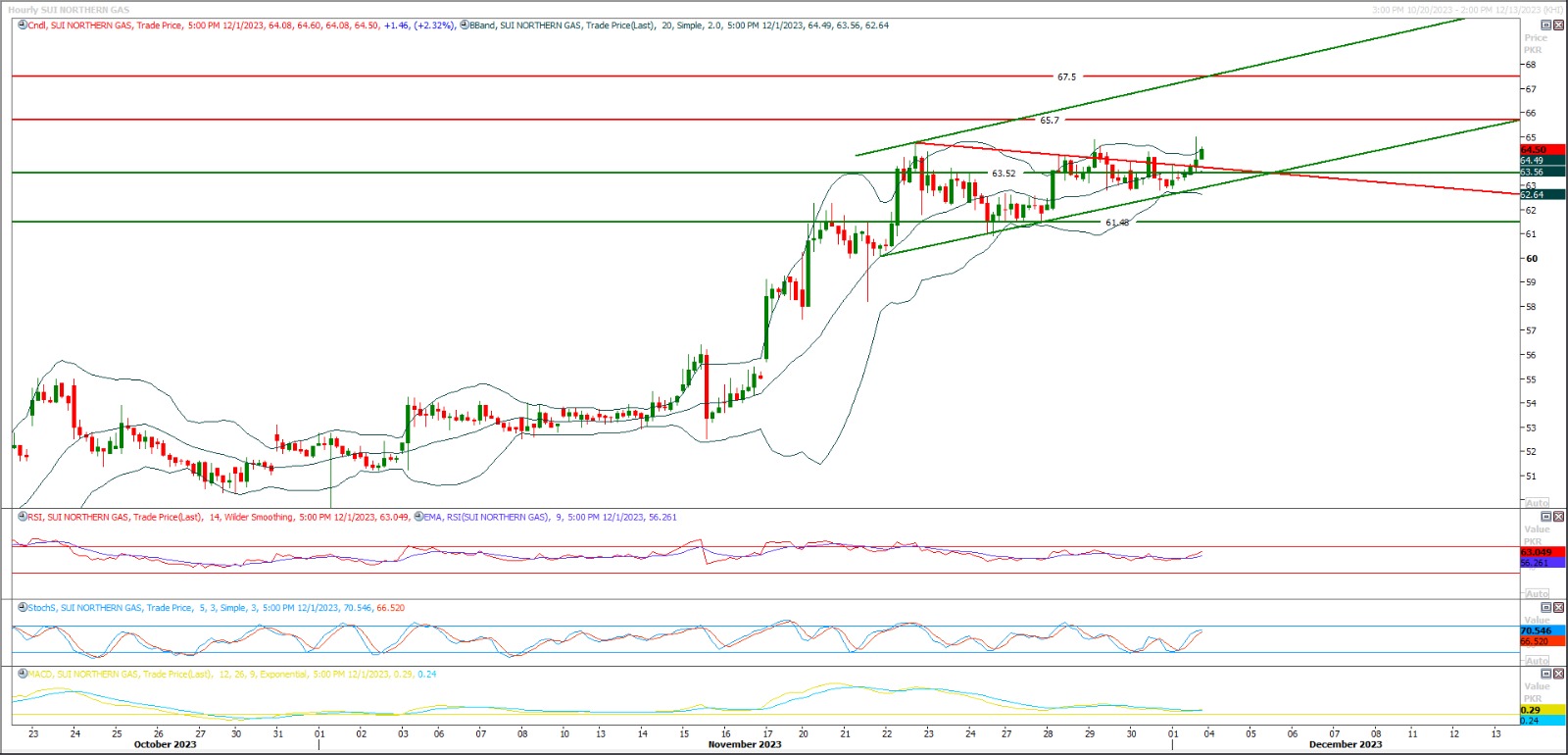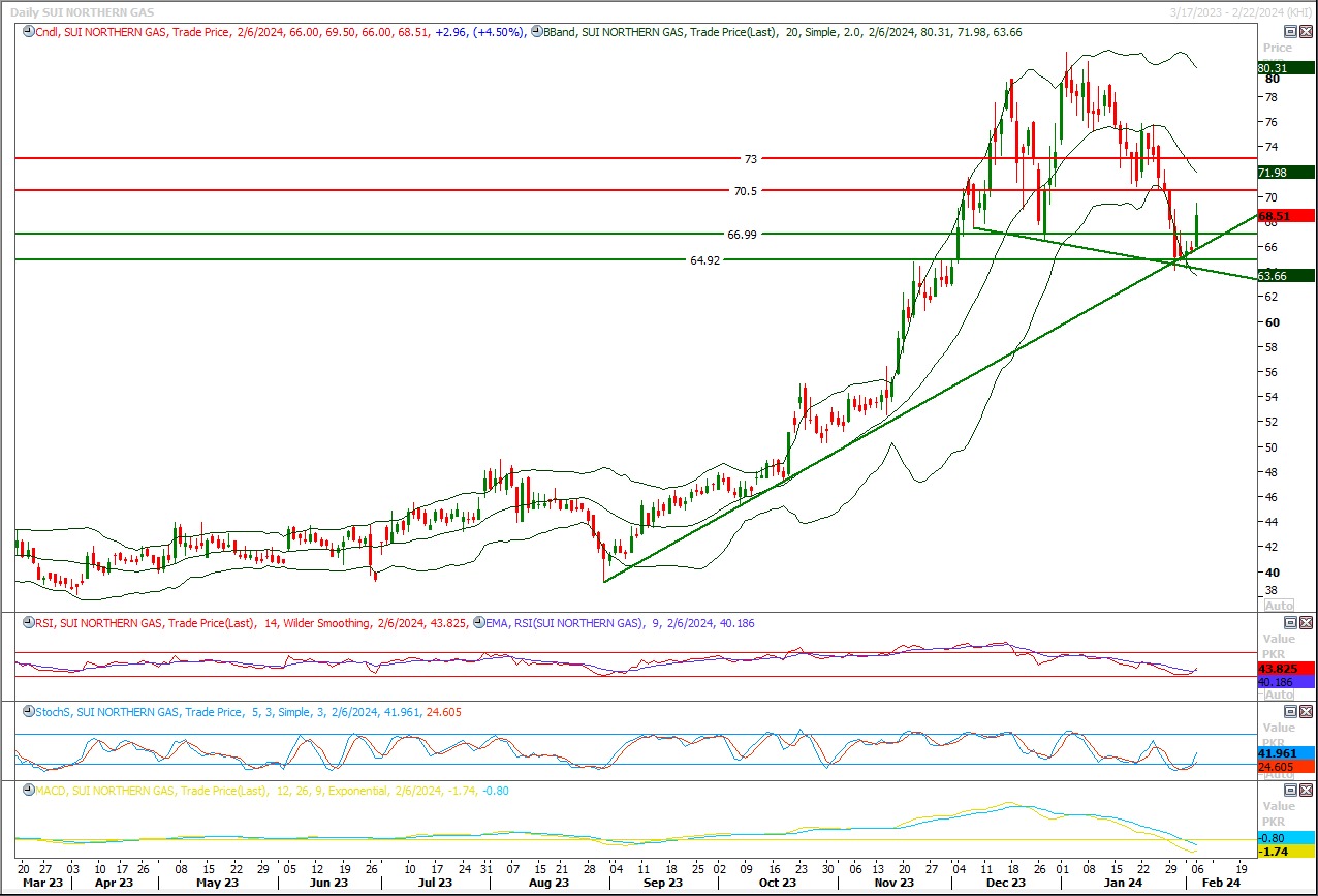 Buy above 67.50 with strict stop loss of 65 and profit target at 70.50 with extension towards 73.TECH NTOE: SNGP is moving back after getting support from strong supportive objects on daily chart and momentum indicators are gaining strength.