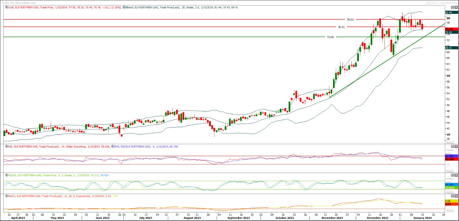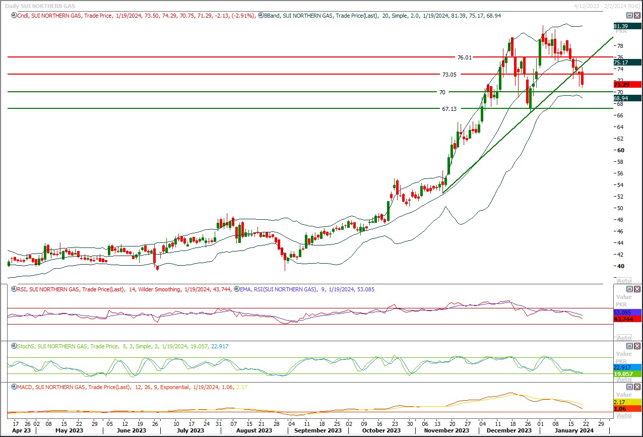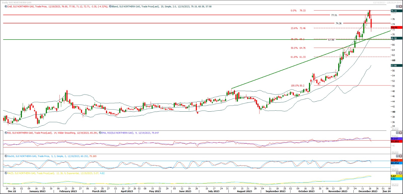 Buy above 67.50 with strict stop loss of 65 and profit target at 70.50 with extension towards 73.TECH NTOE: SNGP is moving back after getting support from strong supportive objects on daily chart and momentum indicators are gaining strength.